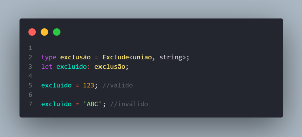 Assim como podemos criar um tipo novo a partir da união de tipos, podemos fazer o inverso, excluído um tipo de uma união usando o tipo auxiliar “Exclude”.