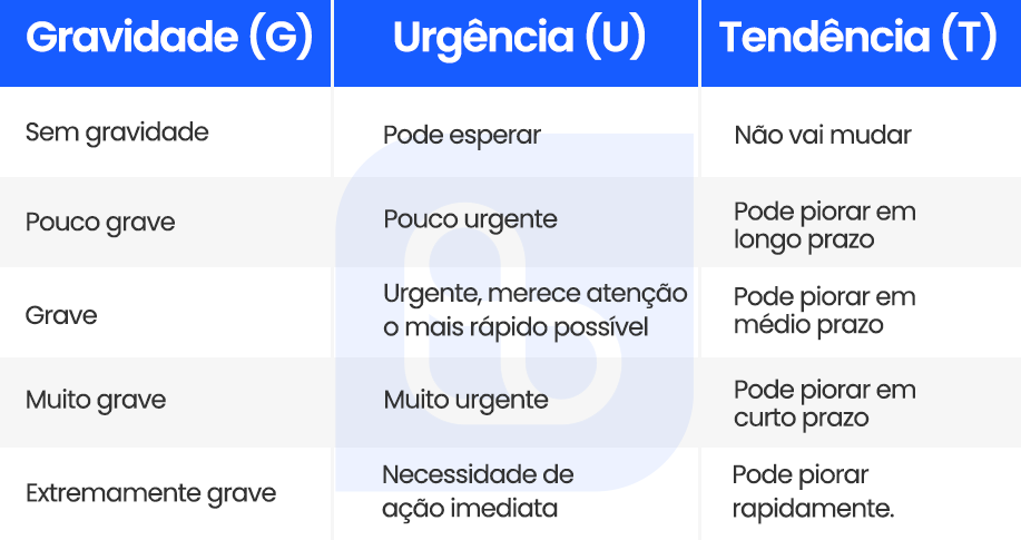 - Gravidade (G): avalia o impacto ou a intensidade que o problema situação pode causar se não for solucionado. Esse impacto pode estar relacionado aos colaboradores, processos, tarefas, resultados da empresa, assunto financeiro, risco de falência, perda de cliente, danos à imagem ou qualquer outro ponto crítico dependendo da organização.