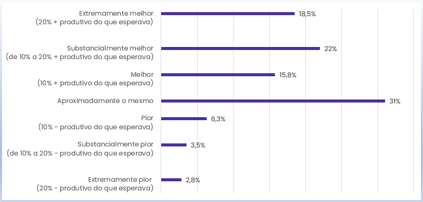 Para entender como os acordos de trabalho durante a Pandemia Covid-19 impactaram a produtividade o Banco Europeu para a Reconstrução e o Desenvolvimento contratou uma pesquisa global realizada pelos economistas Bloom, Barrero e Davis (2022), na qual os entrevistados precisaram responder a seguinte pergunta: “Comparado com suas expectativas antes do COVID (em 2019) como foi trabalhar em casa para você?” O resultado está listado abaixo: