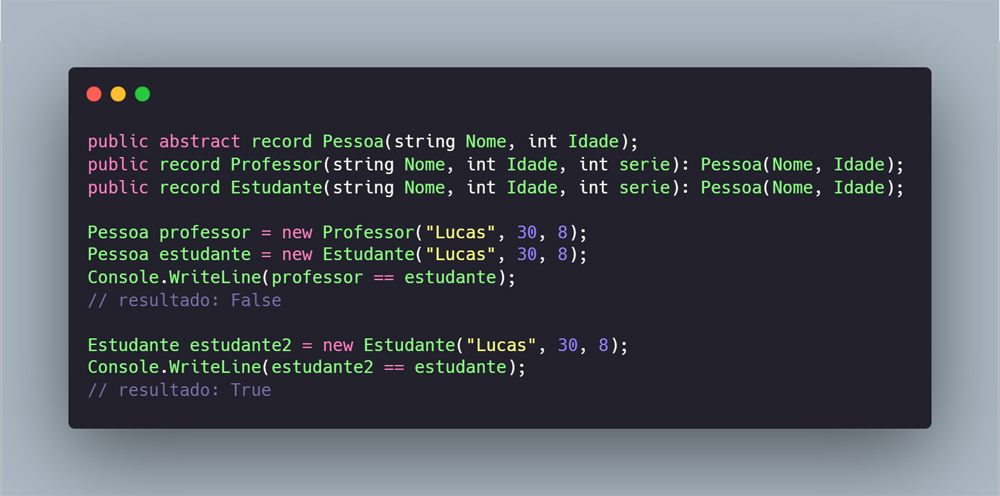 Como vimos anteriormente, a comparação de igualdade para objetos record leva em conta o tipo do objeto. No exemplo abaixo, mesmo com variáveis do mesmo tipo Pessoa, os objetos são de tipos diferentes, retornando false. No segundo exemplo, mesmo tendo uma variável do tipo Pessoa e outra do tipo Estudante, os dois objetos são do tipo estudante, fazendo com que o retorno seja true.