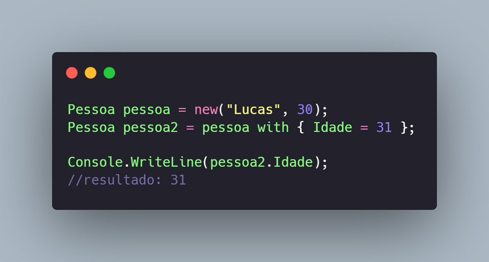Em alguns casos, pode ser necessário copiar um record C#, porém alterando informações. Para esses casos, existe o conceito de mutação não destrutiva, onde iremos utilizar a palavra with para definir os campos que serão alterados.